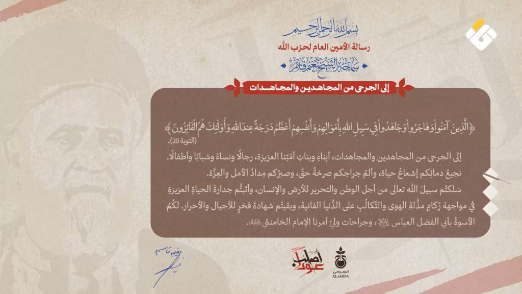 وجّه الأمين العام لحزب الله الشيخ نعيم قاسم، رسالة إلى الجرحى من المجاهدين والمجاهدات، توجّه فيها بالتحية والتقدير إلى أبناء وبنات الأمة، رجالًا ونساءً وشبابًا وأطفالًا، معتبرًا أن نجيع دمائهم إشعاع حياة، وأن آلام جراحهم صرخة حق، وصبرهم مداد الأمل والعزّة.